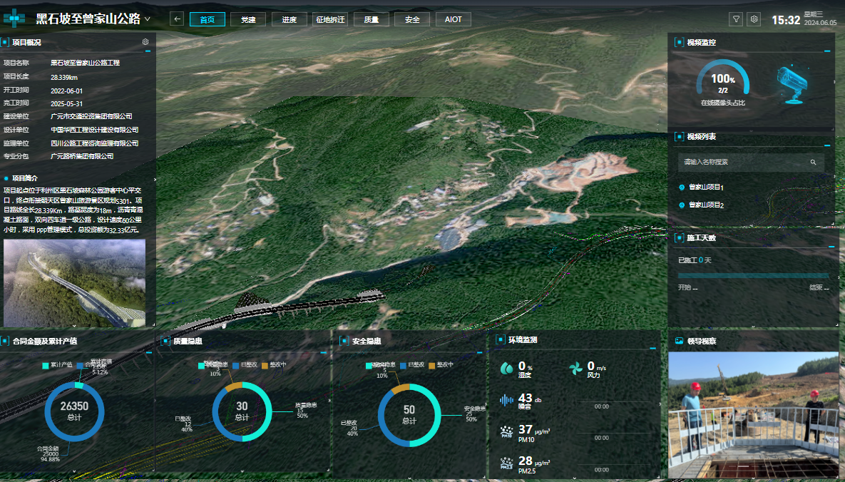 為強(qiáng)化風(fēng)險(xiǎn)管控,黑曾路項(xiàng)目部引入智慧信息化可視管理平臺(tái),綜合運(yùn)用BIM、GIS、物聯(lián)網(wǎng)、大數(shù)據(jù)、人工智能、無人機(jī)等先進(jìn)技術(shù),構(gòu)建基于BIM+GIS+IOT+AI+PM的智慧工地平臺(tái),實(shí)現(xiàn)進(jìn)度、質(zhì)量、安全等全方位智能化管控。